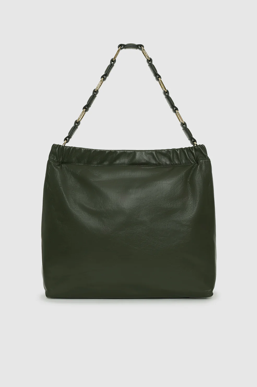A shoulder bag constructed from smooth olive green leather with a subtle sheen.